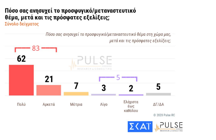 Στην ερώτηση πόσο ανησυχούν για το προσφυγικό/ μεταναστευτικό μετά και τις πρόσφατες εξελίξεις το 83% των ερωτώμενων συνολικά απαντά πολύ (62%) ή αρκετά (21%), το 7% μέτρια, ενώ συνολικά το 5% λίγο (3%) ή ελάχιστα έως καθόλου (2%). Το 5% απαντά δηλώνει δεν ξέρω/ δεν απαντώ.