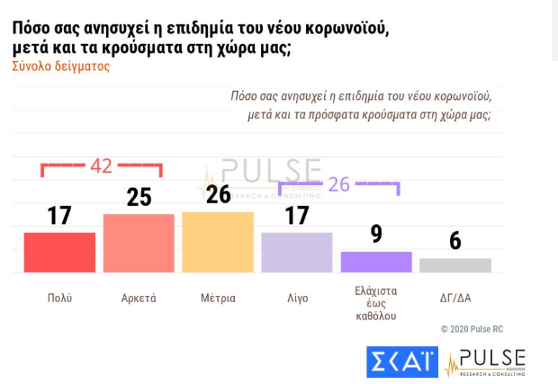 Ειδικότερα, στην ερώτηση πόσο ανησυχούν οι πολίτες για τον κορωνοϊό μετά και τα νέα κρούσματα στη χώρα μας συνολικά το 42% των πολιτών απαντά ότι ανησυχεί πολύ (17%), ή αρκετά (25%), το 26% μέτρια, ενώ συνολικά το 26% από λίγο (17%) έως ελάχιστα ή καθόλου (9%). Το 6% των ερωτηθέντων δηλώνει δεν ξέρω/ δεν απαντώ.