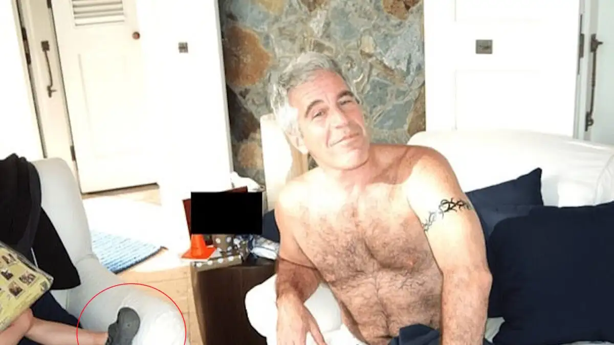 Ανάμεσα στις φωτογραφίες διακρίνεται και μία με τον ημίγυμνο Έπσταϊν, όπου φαίνεται δίπλα του ένα παιδικό πόδι που φοράει αντίστοιχο παιδικό σανδάλι. Μετά τις αποκαλύψεις η εικόνα προκαλεί τρόμο.