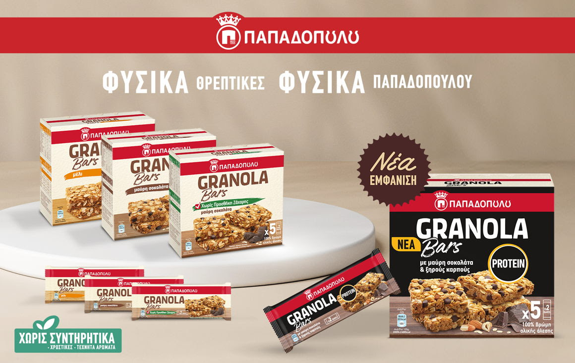 Οι νέες Granola Protein Bars ΠΑΠΑΔΟΠΟΥΛΟΥ έρχονται να προστεθούν στην ήδη αγαπημένη σειρά Granola Bars, που μπήκαν δυναμικά στη ζωή μας το 2022 με τρεις υπέροχες γεύσεις: μαύρη σοκολάτα, μαύρη σοκολάτα Χωρίς Προσθήκη Ζάχαρης και μέλι. Πρόκειται να κυκλοφορήσουν με ανανεωμένη εμφάνιση!