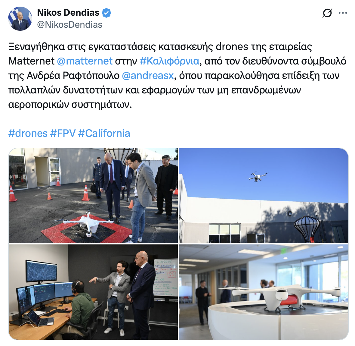 Με ανάρτηση του στο Χ ο κ. Δένδιας αναφέρει ότι ξεναγήθηκε από τον διευθύνοντα σύμβουλο της εταιρείας Ανδρέα Ραφτόπουλο ενώ υπογραμμίζει: «Παρακολούθησα επίδειξη των πολλαπλών δυνατοτήτων και εφαρμογών των μη επανδρωμένων αεροπορικών συστημάτων».