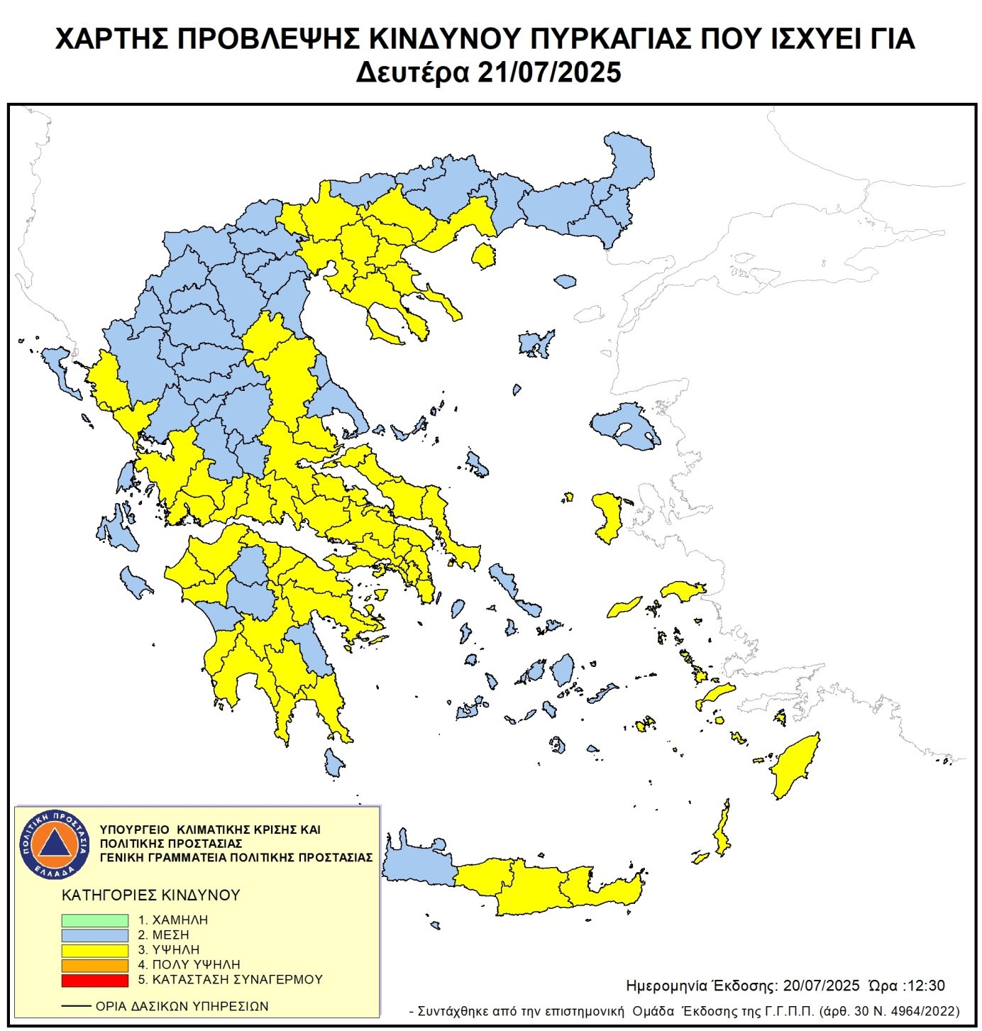 Δείτε στο χάρτη τις περιοχές που αντιμετωπίζουν κίνδυνο σήμερα, Δευτέρα 21 Ιουλίου
