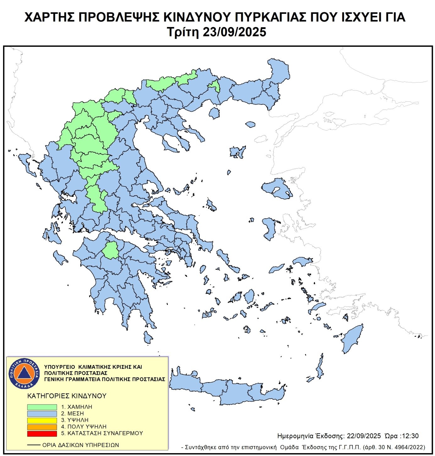 Ο κίνδυνος είναι χαμηλός. Η πιθανότητα για εκδήλωση πυρκαγιάς δεν είναι ιδιαίτερα υψηλή. Εάν εκδηλωθεί πυρκαγιά, οι συνθήκες (κατάσταση καύσιμης ύλης, μετεωρολογικές συνθήκες) δεν θα ευνοήσουν τη γρήγορη εξέλιξή της.