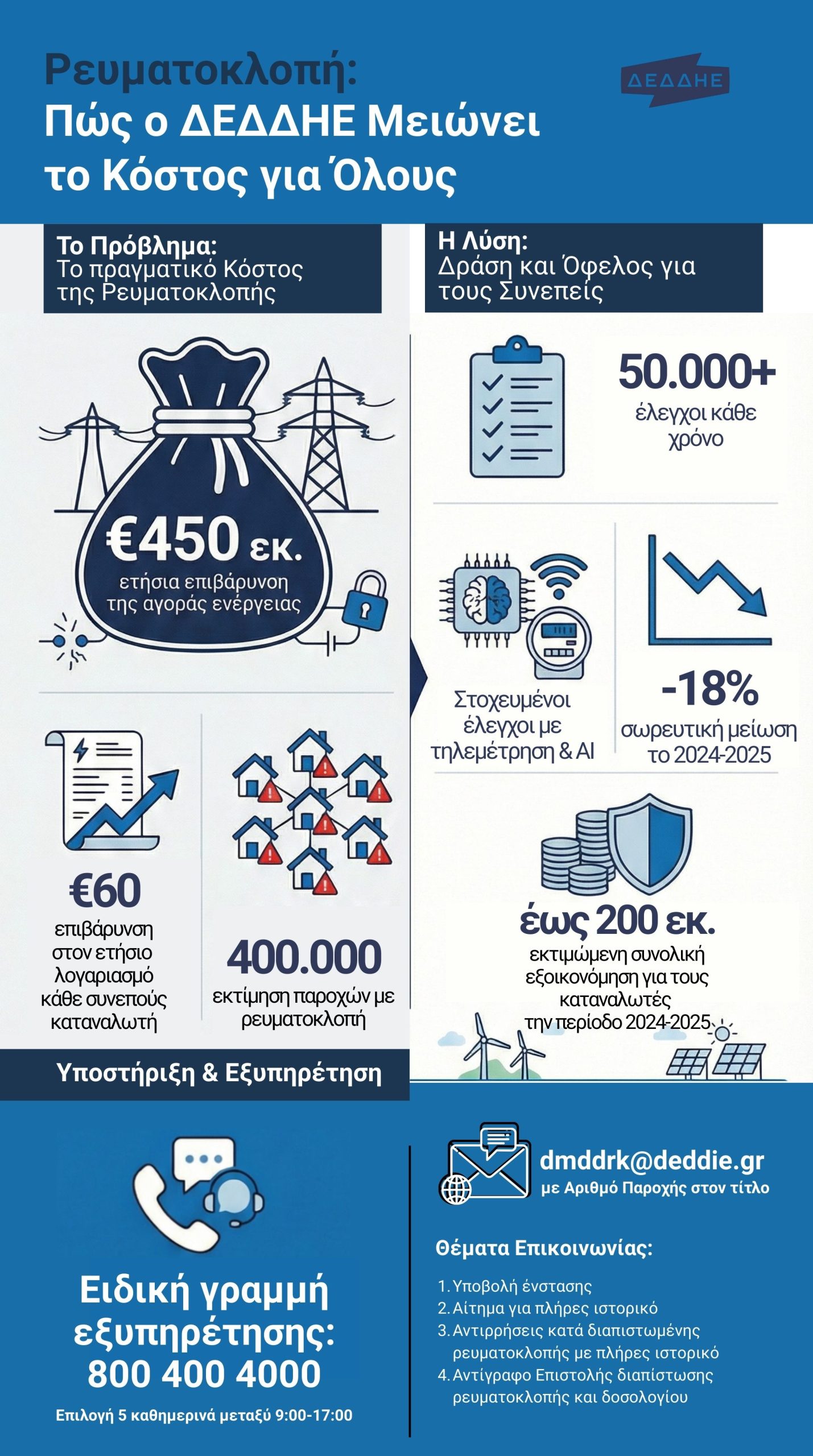 Διευκρινίζεται ότι ο ΔΕΔΔΗΕ δεν αποκομίζει οικονομικό όφελος από τα πρόστιμα ρευματοκλοπών. Τα σχετικά ποσά κατευθύνονται, σύμφωνα με το ισχύον ρυθμιστικό πλαίσιο, στους προβλεπόμενους ειδικούς λογαριασμούς και λειτουργούν υπέρ των συνεπών καταναλωτών, συμβάλλοντας στη μείωση του τελικού κόστους χρεώσεων.