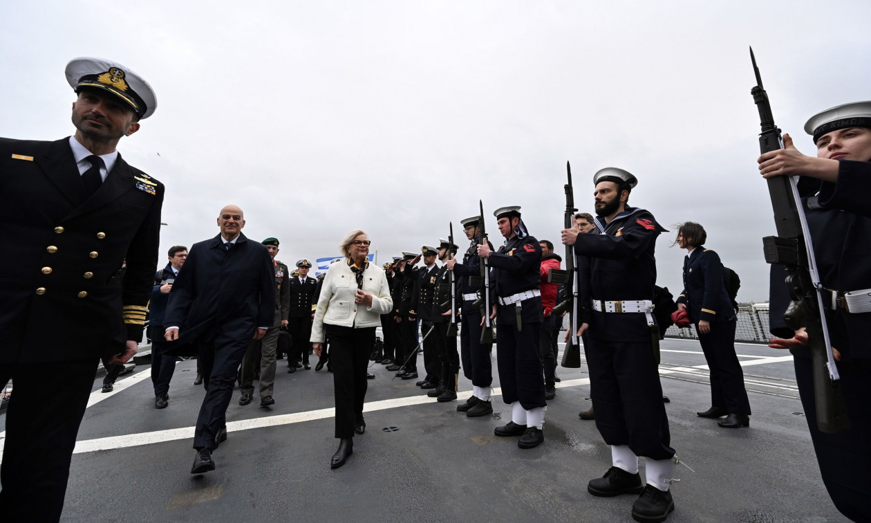 Στον ναύσταθμο Σαλαμίνας ο υπουργός Εθνικής Άμυνας Νίκος Δένδιας υποδέχτηκε τη Γαλλίδα ομόλογό του Κατρίν Βοτρέν.