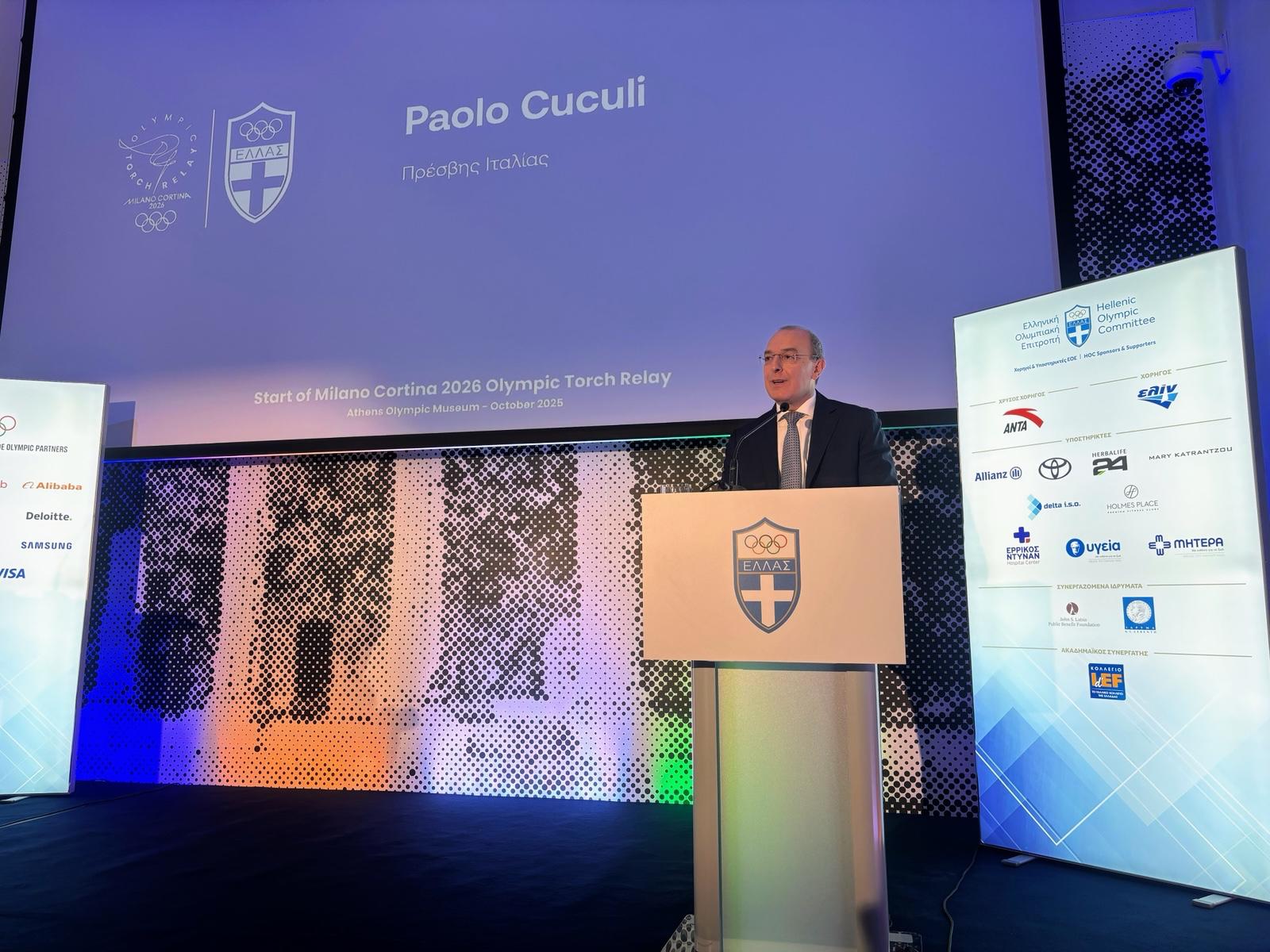 Ο Πρέσβυς της Ιταλίας στην Ελλάδα, κ. Paolo Cuculi, συμμετείχε στη συνέντευξη Τύπου που δόθηκε σε πλήθος δημοσιογράφων για την παρουσίαση των επερχόμενων Χειμερινών Ολυμπιακών και Παραολυμπιακών Αγώνων Milano Cortina 2026 στο Ολυμπιακό Μουσείο Αθήνας. Στην εκδήλωση παρευρέθηκαν, μεταξύ άλλων, ο Πρόεδρος της Ελληνικής Ολυμπιακής Επιτροπής, Ισίδωρος Κούβελος, και ο Γενικός Γραμματέας Αθλητισμού, Γιώργος Μαυρωτάς.