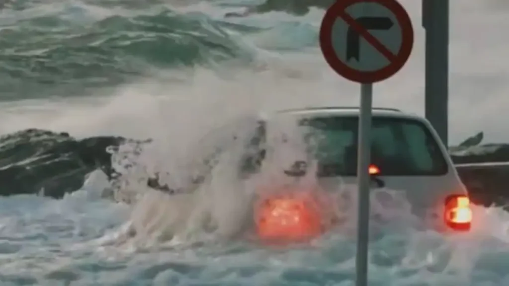 Μέσα στο χαός, οδηγός αποφάσισε να ρισκάρει για να σώσει το αυτοκίνητό του. Εκείνος καταγράφηκε σε βίντεο που τον δείχνει να παλεύει κυριολεκτικά με τα κύματα για να απομακρύνει το αυτοκίνητό του.
