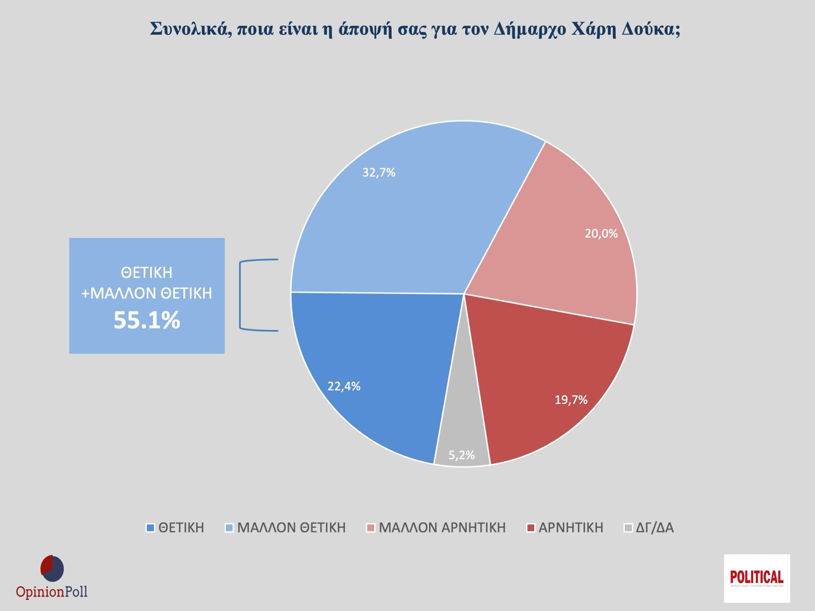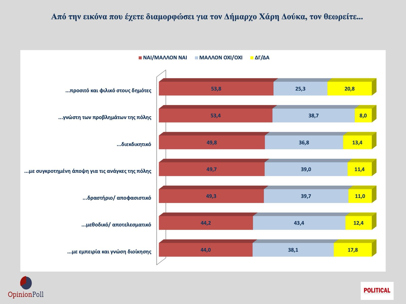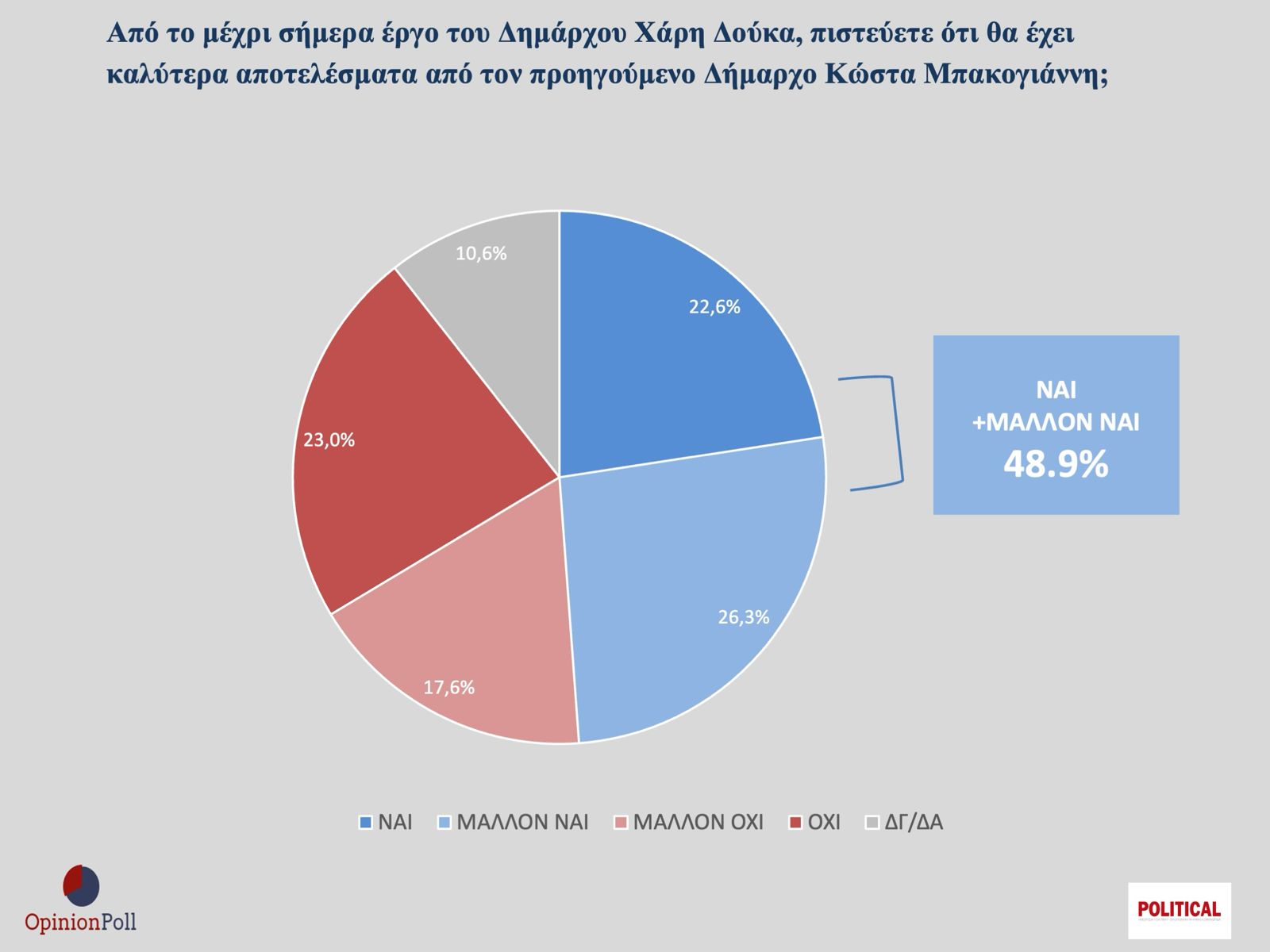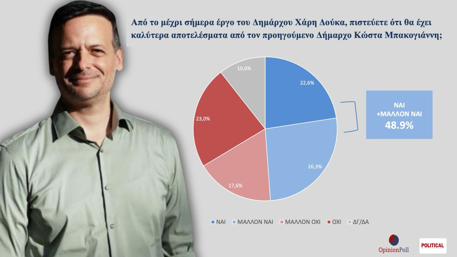 Σύμφωνα με την έρευνα, το 48,9% των πολιτών εκτιμά ότι ο Χάρης Δούκας θα παρουσιάσει καλύτερα αποτελέσματα σε σχέση με τον Κώστα Μπακογιάννη. Ενδεικτικό είναι ότι το 55,1% διατηρεί συνολικά θετική άποψη για το έργο του, γεγονός που αποτυπώνει αποδοχή πέρα από κομματικά όρια.