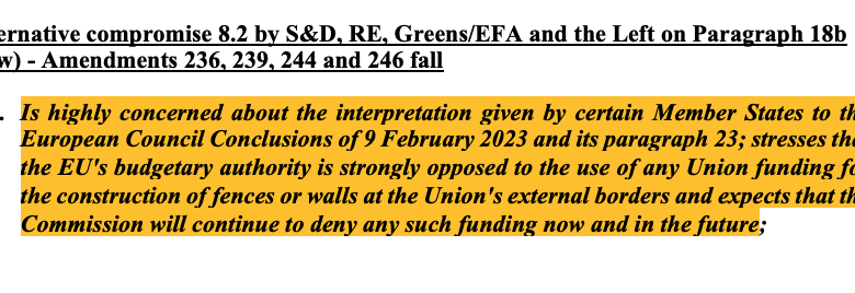 Ξεκάθαρη και σαφή θέση κατά της προσπάθειας ορισμένων ευρωπαϊκών κυβερνήσεων, συμπεριλαμβανομένων της Ελλάδας, της Ιταλίας και της Αυστρίας, να κάνουν χρήση οποιαδήποτε ενωσιακής χρηματοδότησης για την κατασκευή φραχτών στα εξωτερικά σύνορα, παίρνει το Ευρωκοινοβούλιο με την υπερψήφιση τροπολογίας της Αριστεράς, των Σοσιαλιστών, των Πρασίνων και του Renew Europe στην Επιτροπή Προϋπολογισμών (BUDG) του Ευρωκοινοβουλίου.