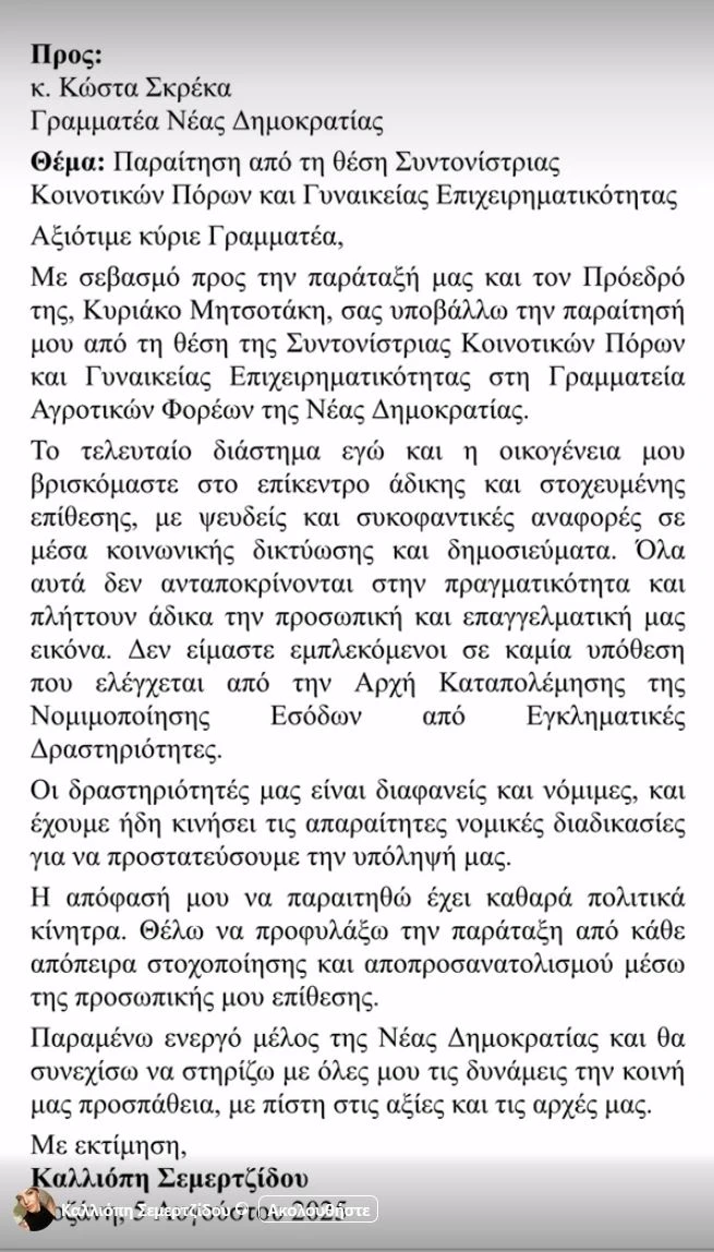 Με επιστολή της προς τον γραμματέα της Νέας Δημοκρατίας, Κώστα Σκρέκα, η Καλλιόπη Σεμερτζίδου, το όνομα της οποίας ενεπλάκη με την υπόθεση του ΟΠΕΚΕΠΕ, παραιτήθηκε από τη θέση της Συντονίστριας Κοινοτικών Πόρων και Γυναικείας Επιχειρηματικότητας της ΝΔ.