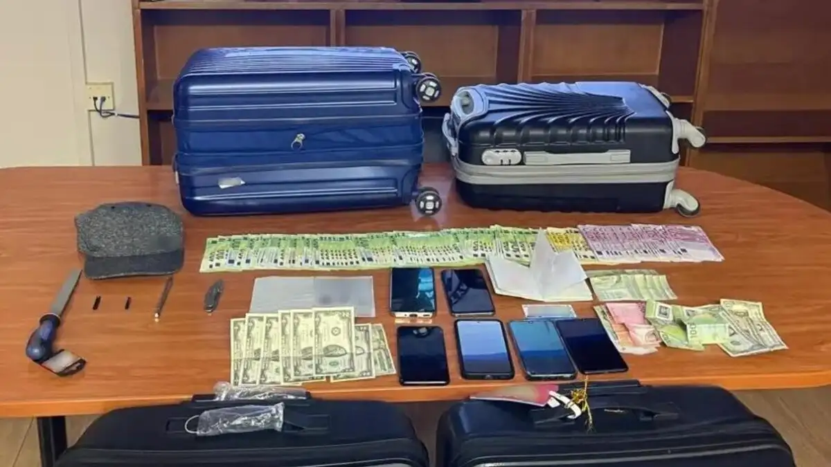 Μετά από έρευνα βρέθηκαν στην κατοχή τους και κατασχέθηκαν: 4 ταξιδιωτικές βαλίτσες, το χρηματικό ποσό των 4.170 ευρώ, 37 δολαρίων ΗΠΑ, 10 λιρών Αγγλίας, 18.000 πέσος Χιλής και 1.000 πέσος Κολομβίας, εργαλείο θραύσης υαλοπινάκων, αναδιπλούμενο μαχαίρι και λίμα, 3 διαβατήρια αμφιβόλου γνησιότητας, 2 κράνη, ρουχισμός, 6 κινητά τηλέφωνα και μικροποσότητα κάνναβης.