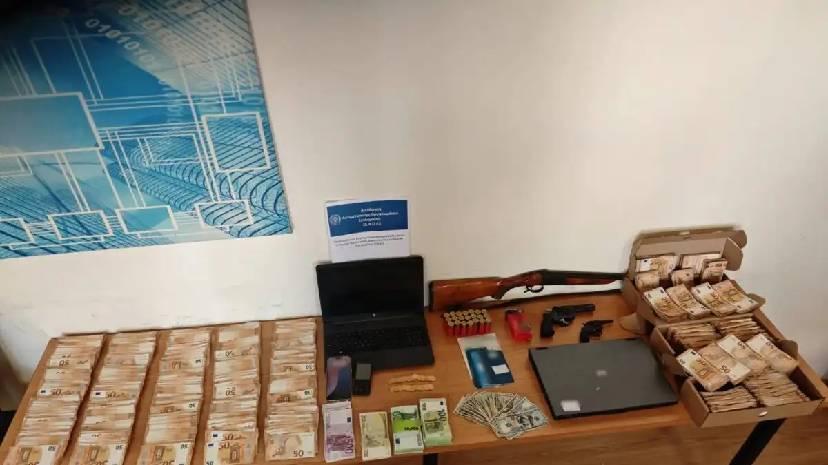 Σύμφωνα με την αστυνομία κατασχέθηκαν μεταξύ άλλων, τραπεζικές επιταγές, πλήθος τιμολογίων, βιβλιάρια τραπεζικών συναλλαγών, -2- περίστροφα, μαχαίρι τύπου στιλέτο, κυνηγετικό τυφέκιο, 652 δολάρια, 32 λίρες Αγγλίας, πλήθος σφραγίδων και το ποσό των 499.940 ευρώ.