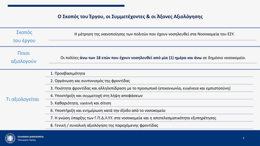 Το ερωτηματολόγιο απευθύνεται στους άνω των 18 ετών που έχουν νοσηλευτεί τουλάχιστον μία ημέρα σε δημόσιο νοσοκομείο, υπό την προϋπόθεση ότι έχουν ενεργοποιήσει την άυλη συνταγογράφηση, και διαρθρώνεται στους εξής άξονες: προσβασιμότητα ασθενών στις υπηρεσίες υγείας (τρόπος και χρονικό διάστημα για την εισαγωγή στο νοσοκομείο), οργάνωση και ποιότητα της φροντίδας που τους παρασχέθηκε, αλληλεπίδραση με το προσωπικό (επικοινωνία, ευγένεια, εμπιστοσύνη), καθαριότητα, υγιεινή και σίτιση, υποστήριξη και συμμετοχή στη λήψη αποφάσεων καθώς και υποστήριξη και ενημέρωση κατά την έξοδο από το νοσοκομείο.