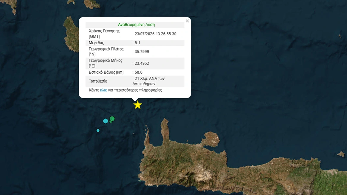 Ισχυρή σεισμική δόνηση μεγέθους 5,1 Ρίχτερ καταγράφηκε το μεσημέρι της Τετάρτης στη θαλάσσια περιοχή ανάμεσα στην Κρήτη και τα Αντικύθηρα.