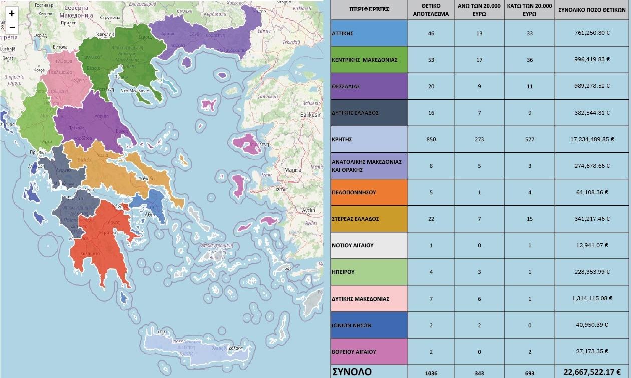 Η προκαταρκτική ποινική έρευνα για τις επίμαχες επιδοτήσεις του ΟΠΕΚΕΠΕ αποδίδει ήδη χειροπιαστά αποτελέσματα: σε 6.354 ΑΦΜ που ελέγχθηκαν, εντοπίστηκαν 1.036 περιπτώσεις με καταλογισμούς 22.667.522,17 ευρώ. Η Κρήτη εμφανίζεται να συγκεντρώνει το μεγαλύτερο μερίδιο των ευρημάτων, ενώ δρομολογούνται δεσμεύσεις περιουσιακών στοιχείων όσων βρεθούν να έχουν λάβει αχρεωστήτως πόρους.