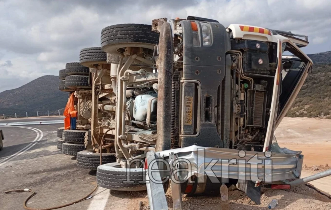 Σοκαριστικό τροχαίο σημειώθηκε στην Κρήτη, καθώς μπετονιέρα ανετράπη λίγα πριν από γκρεμό, με τον οδηγό να εγκλωβίζεται και παράλληλα να ξεσπάει φωτιά στον κινητήρα του οχήματος.