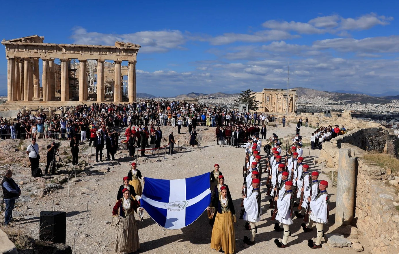 Επίκεντρο των εορτασμών, ο ιερός βράχος της Ακρόπολης, όπου πραγματοποιήθηκε η έπαρση της σημαίας με άγημα της προεδρικής φρουράς, ενώ πλήθος κόσμου παραβρέθηκε στη συγκινητική τελετή.