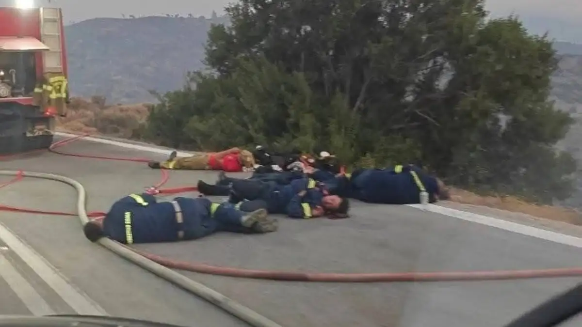 Μια φωτογραφία που δημοσιεύτηκε αποτυπώνει με τον πιο δυνατό τρόπο την πραγματικότητα αυτής της μάχης. Γύρω στους δέκα πυροσβέστες φαίνονται να έχουν ξαπλώσει στη μέση του δρόμου, προσπαθώντας να ξεκουραστούν για λίγα λεπτά. Τα σώματα τους μαρτυρούν την εξάντληση, όμως η ανάγκη να συνεχίσουν το έργο τους τους κάνει να παίρνουν δυνάμεις ακόμη και σε αυτές τις συνθήκες.