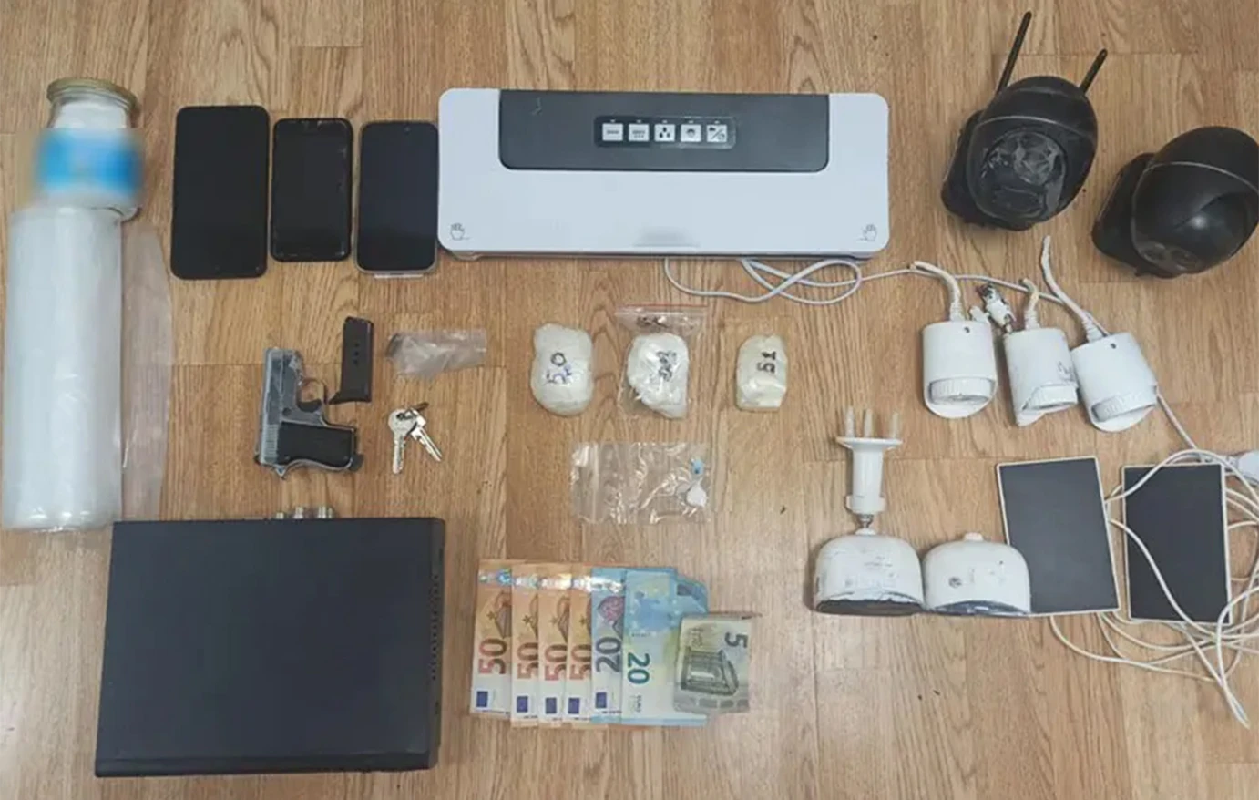 Συνολικά κατασχέθηκαν: 153,1 γραμμάρια κοκαΐνης, το ποσό των 245 ευρώ, ένα πιστόλι με γεμιστήρα και φυσίγγιο, ηλεκτρική συσκευή κένωσης, επτά επιτοίχιες κάμερες, δύο ηλιακά πάνελ φόρτισης, καταγραφικό σύστημα, πλήθος νάιλον συσκευασιών και τρία κινητά τηλέφωνα.