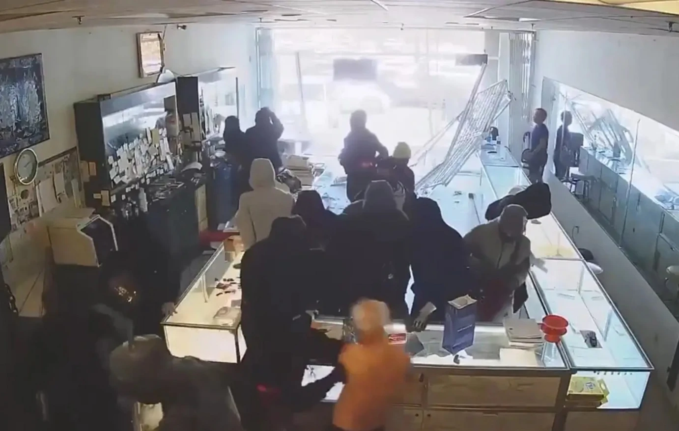 Το βίντεο δείχνει το περιστατικό να ξεκινά με ένα SUV που κάνει όπισθεν και σπάει τη βιτρίνα του οικογενειακού καταστήματος, ενώ οι δράστες – ντυμένοι στα μαύρα και με μάσκες – εισβάλλουν. Ένας από αυτούς ακούγεται να φωνάζει «get the f–k down».