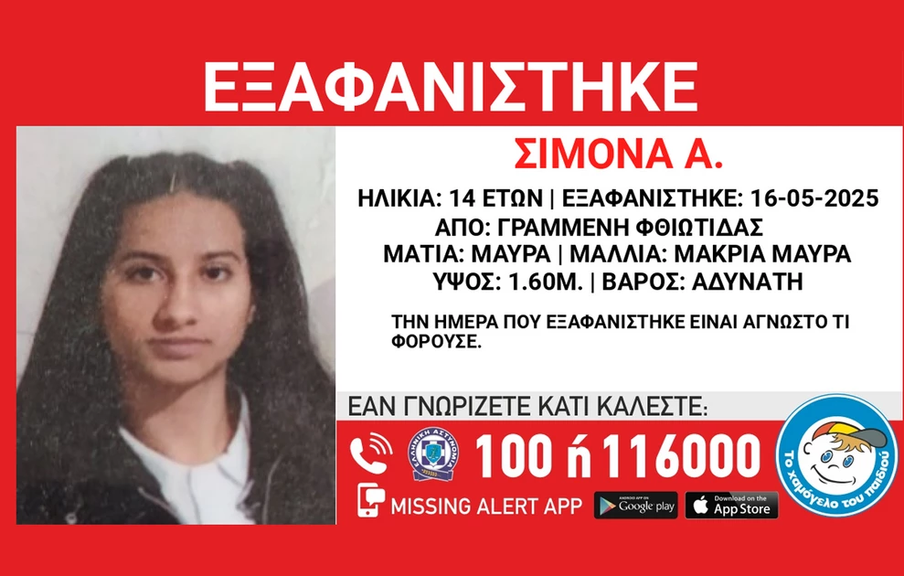 «Στις 16/05/2025 και ώρα 06:00 π.μ. εξαφανίστηκε από τη Γραμμένη Φθιώτιδας η ανήλικη Σιμόνα Α., 14 ετών, βουλγαρικής καταγωγής. Το “Χαμόγελο του Παιδιού” ενημερώθηκε σήμερα, 16/05/2025 για την εξαφάνισή της και προχώρησε άμεσα στη δημοσιοποίηση των στοιχείων της ανήλικης κατόπιν εισαγγελικής εντολής, καθώς ενδέχεται να υπάρχουν λόγοι που τον θέτουν τη ζωή της σε κίνδυνο.
