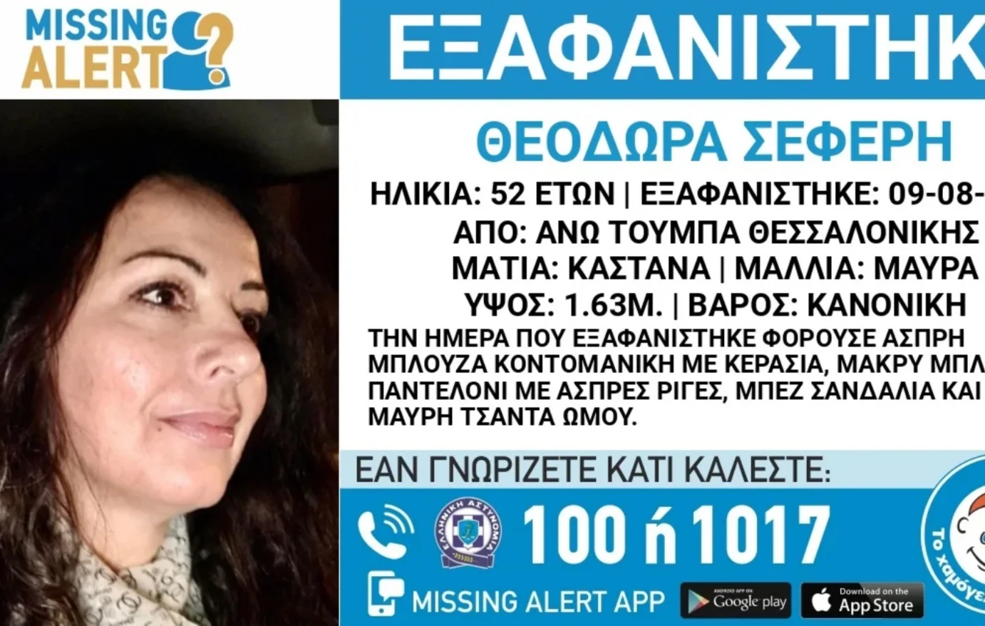 Σύμφωνα με το “Χαμόγελο του Παιδιού”, στις 09/08/2025, πρωινές ώρες, εξαφανίστηκε από την περιοχή της Άνω Τούμπας στην Θεσσαλονίκη, η Θεοδώρα Σεφέρη, 52 ετών. «Το Χαμόγελο του Παιδιού» ενημερώθηκε σήμερα, 10/08/2025, για την εξαφάνιση της Θεοδώρας Σεφέρη και προχώρησε στη δημοσιοποίηση των στοιχείων της ενήλικης κατόπιν αιτήματος της οικογένειας της, καθώς ενδέχεται να συντρέχουν λόγοι οι οποίοι θέτουν τη ζωή της σε κίνδυνο.