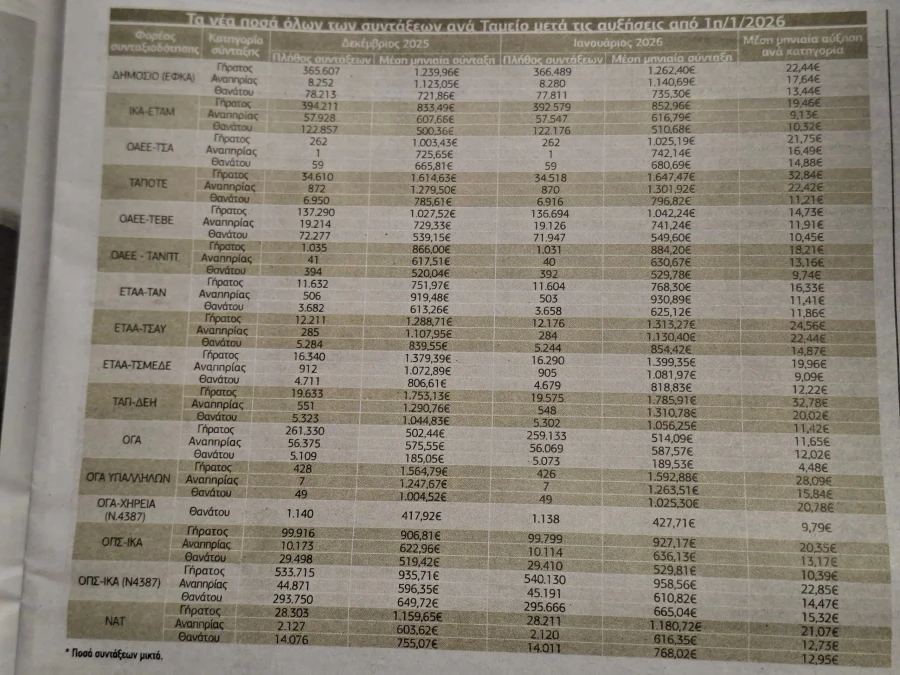 Συντάξεις… Αύξηση έλαβαν περίπου 2,5 εκατομμύρια συνταξιούχοι, με τη μέση κύρια σύνταξη λόγω γήρατος να διαμορφώνεται στα 975 ευρώ, όπως αναφέρει το ρεπορτάζ του «Ελεύθερου Τύπου».