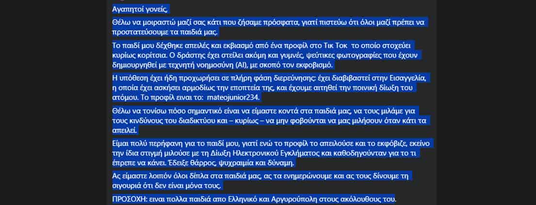 Η ανοιχτή έκκληση μητέρας μετά την παρενόχληση της κόρης της από τον λογαριασμό “mateojunior234” υπογραμμίζει την ανάγκη για πρόληψη και γονική στήριξη.