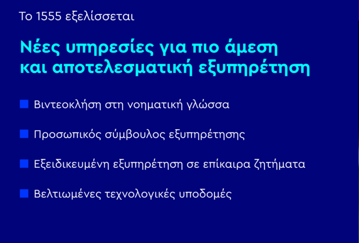 Η καθημερινή επικοινωνία των πολιτών με το κράτος γίνεται πιο άμεση, πιο αποτελεσματική και πιο προσβάσιμη από ποτέ. Το 1555, ο ενιαίος αριθμός ενημέρωσης και εξυπηρέτησης πολιτών του Υπουργείου Εργασίας και Κοινωνικής Ασφάλισης, αναβαθμίζεται, προσφέροντας σύγχρονες λύσεις που εξασφαλίζουν ταχύτητα, ...