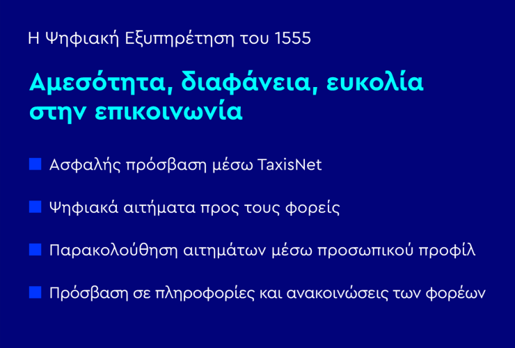 Η επικοινωνία των πολιτών με τη δημόσια διοίκηση γίνεται πιο εύκολη και αποτελεσματική από ποτέ. Μέσω της Ψηφιακής Εξυπηρέτησης του 1555, οι πολίτες αποκτούν πρόσβαση σε ένα σύγχρονο διαδικτυακό περιβάλλον, όπου μπορούν να υποβάλλουν ψηφιακά αιτήματα, να ενημερώνονται για τις ...
