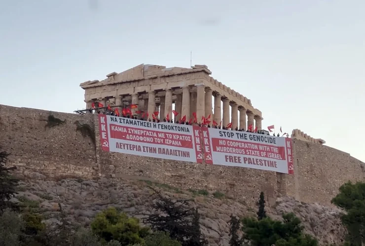 Ένα γιγαντοπανό κρέμασαν στην Ακρόπολη το πρωί της Παρασκευής 19/9 μέλη του ΚΚΕ και της ΚΝΕ ζητώντας να σταματήσει η γεγονοκτόνια στη Γάζα. «Καμία συνεργασία με το κράτος – δολοφόνο του Ισραήλ. Λευτεριά στην Παλαιστίνη», γράφουν τα πανό στα ελληνικά ...