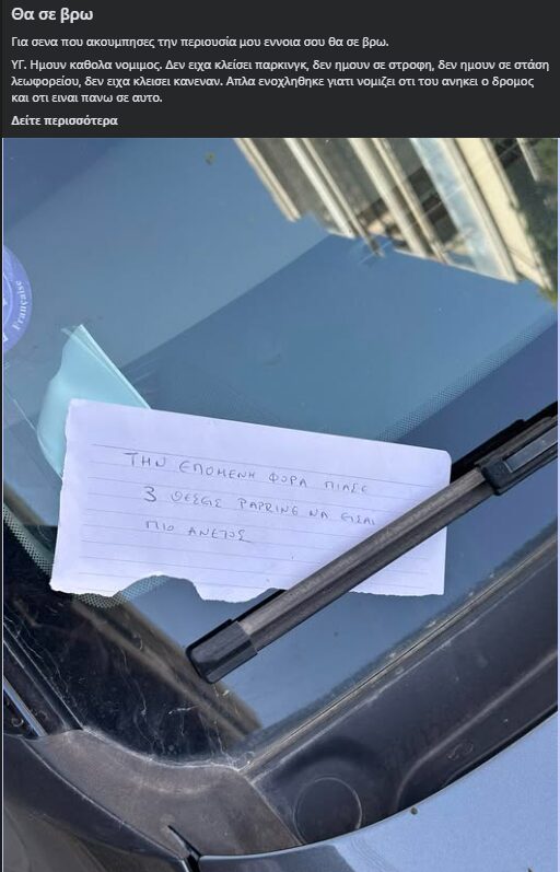 Τη στιγμή που τα «ραβασάκια» στο παρμπρίζ των αυτοκινήτων που έχουν σταθμεύσει παράνομα, δίνουν και παίρνουν, ένας ιδιοκτήτης δεν αντέδρασε καθόλου ψύχραιμα αντικρίζοντας το σημείωμα που του είχαν αφήσει.