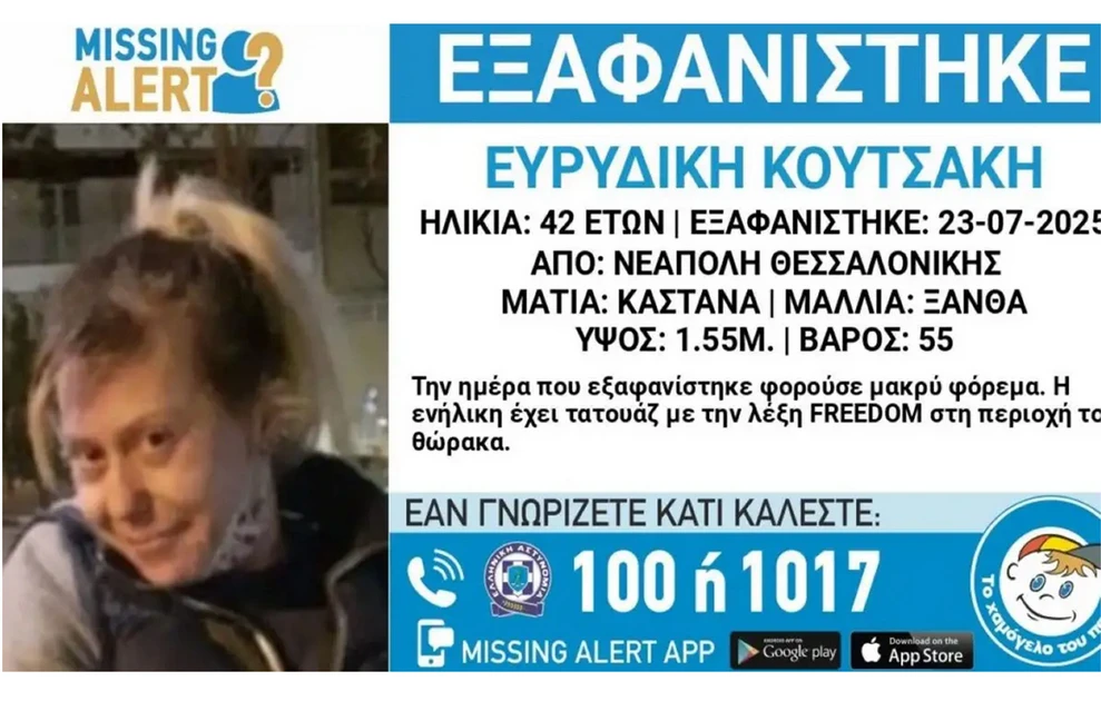 Συναγερμός έχει σημάνει στη Θεσσαλονίκη με την εξαφάνιση της 42χρονης Ευρυδίκης Κουτσάκη τα ίχνη της οποίας χάθηκαν από τις 23 Ιουλίου 2025 από τη Νεάπολη.
