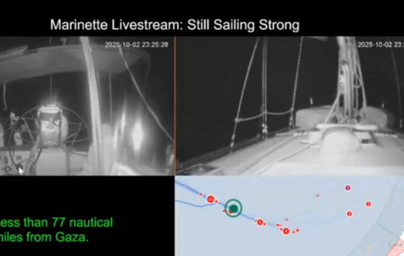 «Το Marinette συνεχίζει να πλέει», επεσήμαναν οι διοργανωτές του Global Sumud Flotilla χθες το βράδυ στα μέσα κοινωνικής δικτύωσης, προσθέτοντας ότι αναμένουν να αναχαιτιστεί και αυτό σύντομα. «Γνωρίζουμε τι μας περιμένει», τόνισαν.