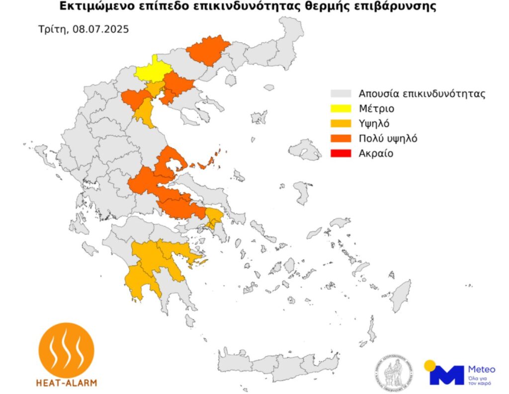 – Σήμερα (08/07) πολύ υψηλή θερμική επιβάρυνση σε περιοχές της Κεντρικής και της Ανατολικής Μακεδονίας, της Ανατολικής Θεσσαλίας και της Ανατολικής Στερεάς.
