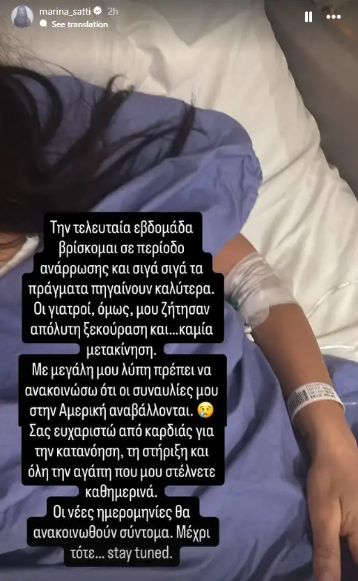 Μία περιπέτεια υγείας ταλαιπωρεί το τελευταίο διάστημα τη Μαρίνα Σάττι, η οποία βρίσκεται στο νοσοκομείο εδώ και κάποιες ημέρες και μάλιστα αναγκάστηκε να βάλει στον «πάγο» όλες τις επαγγελματικές της υποχρεώσεις.