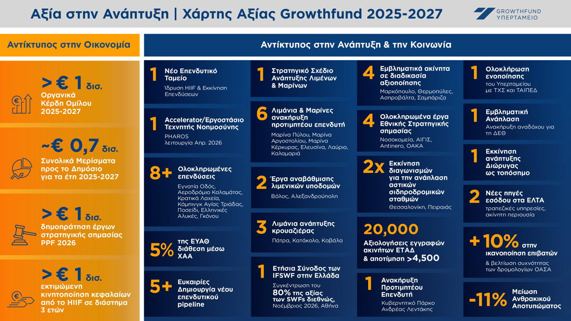 Οι στόχοι της τριετίας 2025–2027 καταγράφονται στον «Χάρτη Αξίας» του Υπερταμείου, που περιγράφει τον αντίκτυπο που θα έχει η υλοποίηση του συνολικού στρατηγικού πλάνου. Η περίοδος 2025–2027 χαρακτηρίζεται από υψηλή ένταση έργων και εμβληματικές παρεμβάσεις, όπως την εκκίνηση της επενδυτικής δραστηριότητας του HIIF και τη λειτουργία του πρώτου εργοστασίου Τεχνητής Νοημοσύνης PHAROS σε συνεργασία με το Υπουργείο Ψηφιακής Διακυβέρνησης. Το Υπερταμείο έχει δρομολογήσει, επίσης, τη δημιουργία ενός ενιαίου Στρατηγικού Σχεδίου Ανάπτυξης Λιμένων & Μαρινών, ενώ σύντομα ολοκληρώνονται τα έργα αναβάθμισης των υποδομών στους λιμένες του Βόλου και της Αλεξανδρούπολης. Το επόμενο διάστημα αναμένεται να εκκινήσει η διαδικασία αξιοποίησης του λιμένα Ελευσίνας μέσω υπο-παραχώρησης εμπορικών δραστηριοτήτων, ενώ σε εξέλιξη βρίσκονται οι διαγωνιστικές διαδικασίες για την αξιοποίηση τεσσάρων ακόμα λιμένων και μαρίνων. Σε εξέλιξη είναι ο διαγωνισμός για την περαιτέρω ανάπτυξη της κρουαζιέρας, ενώ έχει ολοκληρωθεί ο διαγωνισμός για τη νέα Μαρίνα Μεγάλων Σκαφών στην Κέρκυρα. Τέσσερα εμβληματικά ακίνητα ωριμάζουν προς αξιοποίηση, ενώ δύο αστικές αναπλάσεις σιδηροδρομικών σταθμών (ΓΑΙΑΟΣΕ) αναμένεται να αναδείξουν κρίσιμους αστικούς κόμβους, βελτιώνοντας την ποιότητα ζωής των πολιτών. Έως το τέλος του 2027, θα έχουν ολοκληρωθεί 20.000 αξιολογήσεις εγγραφών (ΕΤΑΔ) και άνω των 4.500 αποτιμήσεων ακινήτων, δημιουργώντας σαφή εικόνα της αξίας της δημόσιας ακίνητης περιουσίας. Επίσης, προβλέπεται η ανάπτυξη νέων πηγών εσόδου στα ΕΛΤΑ (όπως τραπεζικές υπηρεσίες και αξιοποίηση ακίνητης περιουσίας) και η περαιτέρω αναβάθμιση των αστικών συγκοινωνιών της Αθήνας (Όμιλος ΟΑΣΑ). Η ανάπλαση της ΔΕΘ και το σχέδιο για την ανάπτυξη της Διώρυγας (ΑΕΔΙΚ) αποτελούν έργα-τοπόσημα με εθνικό αποτύπωμα, ενώ οκτώ επενδύσεις θα έχουν ήδη υλοποιηθεί σε κρίσιμους τομείς. Το PPF αναμένεται να ολοκληρώσει μέσα στο έτος έργα στρατηγικής σημασίας, όπως η αναβάθμιση και επέκταση των υποδομών της Δημόσιας Υγείας και η ανακαίνιση του ΟΑΚΑ, με τον προγραμματισμό της Μονάδας να προβλέπει τη δημοπράτηση νέων έργων ύψους €1 δισ. το 2026.