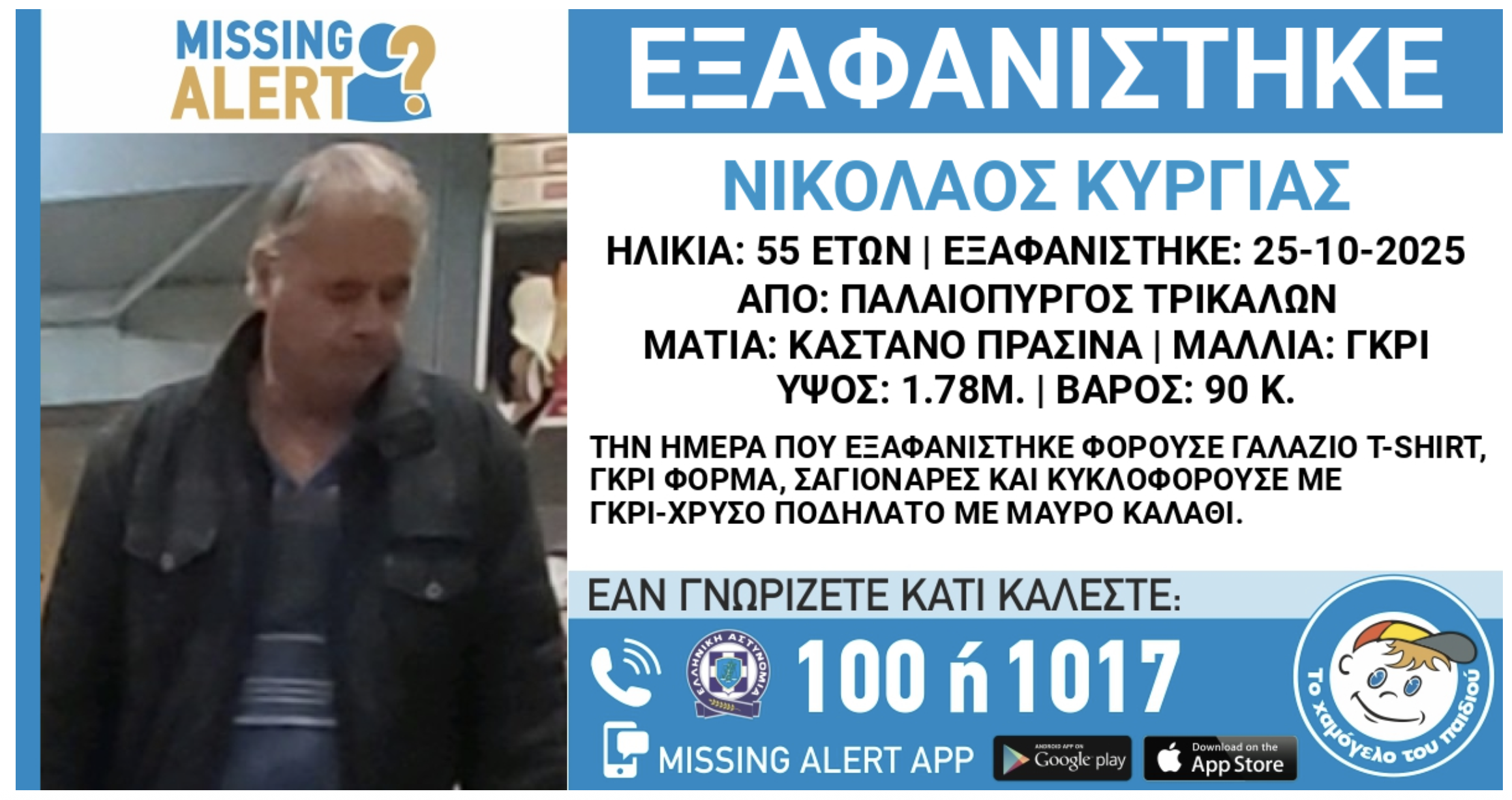 Τις απογευματινές ώρες του Σαββάτου 25 Οκτωβρίου 2025, από την περιοχή Παλαιόπυργου Τρικάλων ο Νικόλαος Κύργιας, 55 ετών.