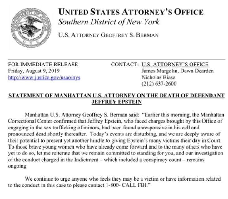 Στο ίδιο έγγραφο, ο τότε ομοσπονδιακός εισαγγελέας του Μανχάταν, Τζέφρι Σ. Μπέρμαν, ανέφερε ότι «Νωρίτερα σήμερα το πρωί, το Manhattan Correctional Center επιβεβαίωσε ότι ο Τζέφρι Έπσταϊν, ο οποίος αντιμετώπιζε κατηγορίες που ασκήθηκαν από το γραφείο μας για συμμετοχή σε σεξουαλική διακίνηση ανηλίκων, βρέθηκε αναίσθητος στο κελί του και λίγο αργότερα διαπιστώθηκε ο θάνατός του», υπογραμμίζοντας τη σημασία της συνέχισης της έρευνας και της στήριξης των θυμάτων.
