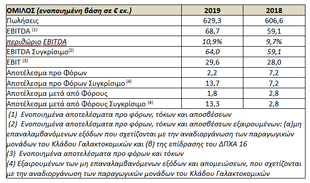 Τα δημοσιευμένα ενοποιημένα κέρδη EBITDA διαμορφώθηκαν σε €68,7 εκ. έναντι €59,1 εκ. το 2018 (+16%), με όλους τους Κλάδους να παρουσιάζουν αύξηση των λειτουργικών τους κερδών. Τα συγκρίσιμα κέρδη EBITDA, εξαιρουμένης της επίδρασης του ΔΠΧΑ 16, καθώς και των μη επαναλαμβανόμενων εξόδων, που σχετίζονται με τη λειτουργική αναδιάρθρωση του Κλάδου Γαλακτοκομικών, ανέρχονται σε €64 εκ. (+8% σε σχέση με το 2018). Οι Κλάδοι του Ομίλου διατήρησαν τις ηγετικές τους θέσεις στις αγορές που δραστηριοποιούνται, παρέχοντας στους καταναλωτές προϊόντα και υπηρεσίες υψηλής ποιότητας και προστιθέμενης αξίας.