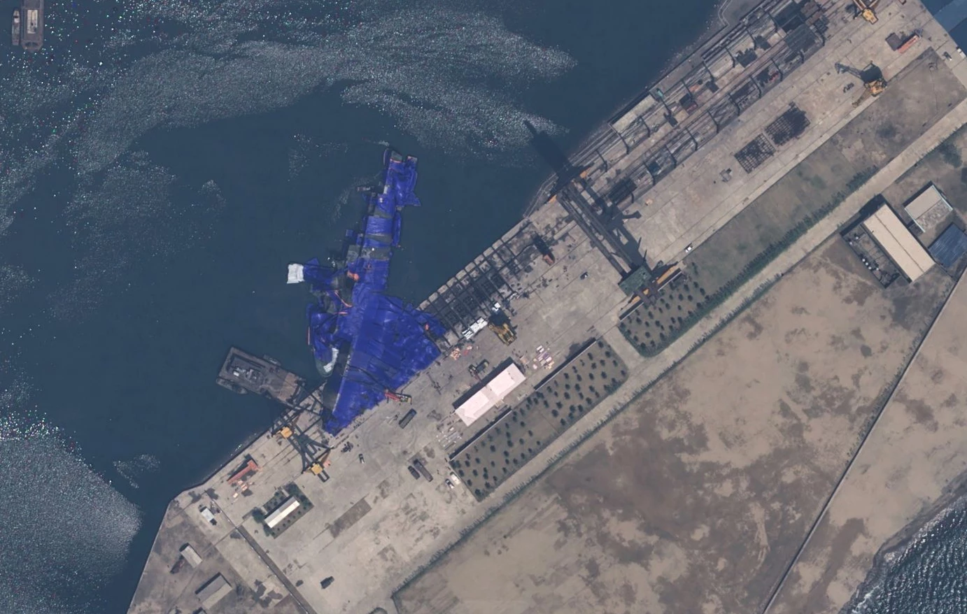 Δορυφορικές εικόνες δείχνουν το πολεμικό πλοίο – καλυμμένο με μπλε μουσαμάδες – να έχει γείρει στο πλάι, με την πρύμνη στραμμένη προς το λιμάνι και την πλώρη να παραμένει στη ράμπα, σύμφωνα το αμερικανικό Κέντρο Στρατηγικών και Διεθνών Σπουδών (CSIS).
